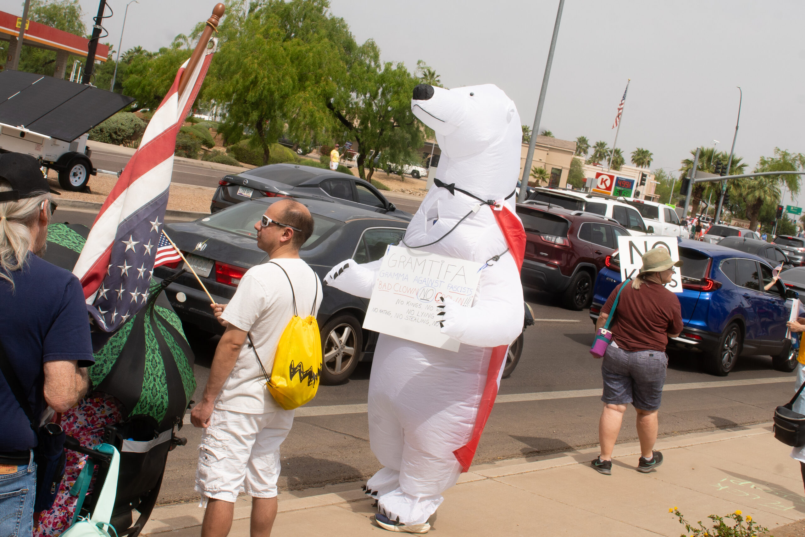 One of the most vocal protestors on the street Saturday was a woman dressed in an inflatable polar bear costume with a Greenland flag waving from her back, 70-year-old Mesa resident Velesta Fusco.
